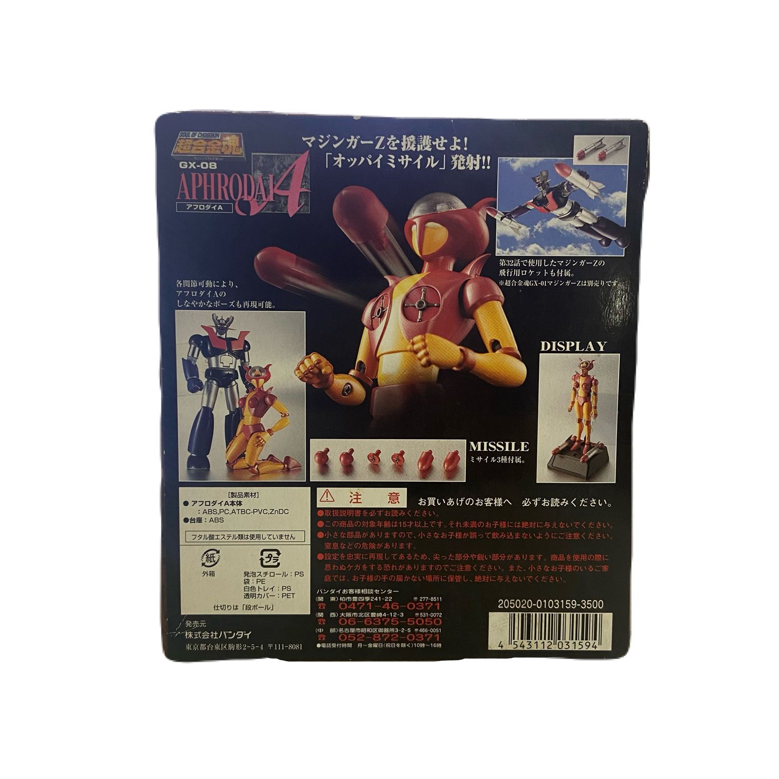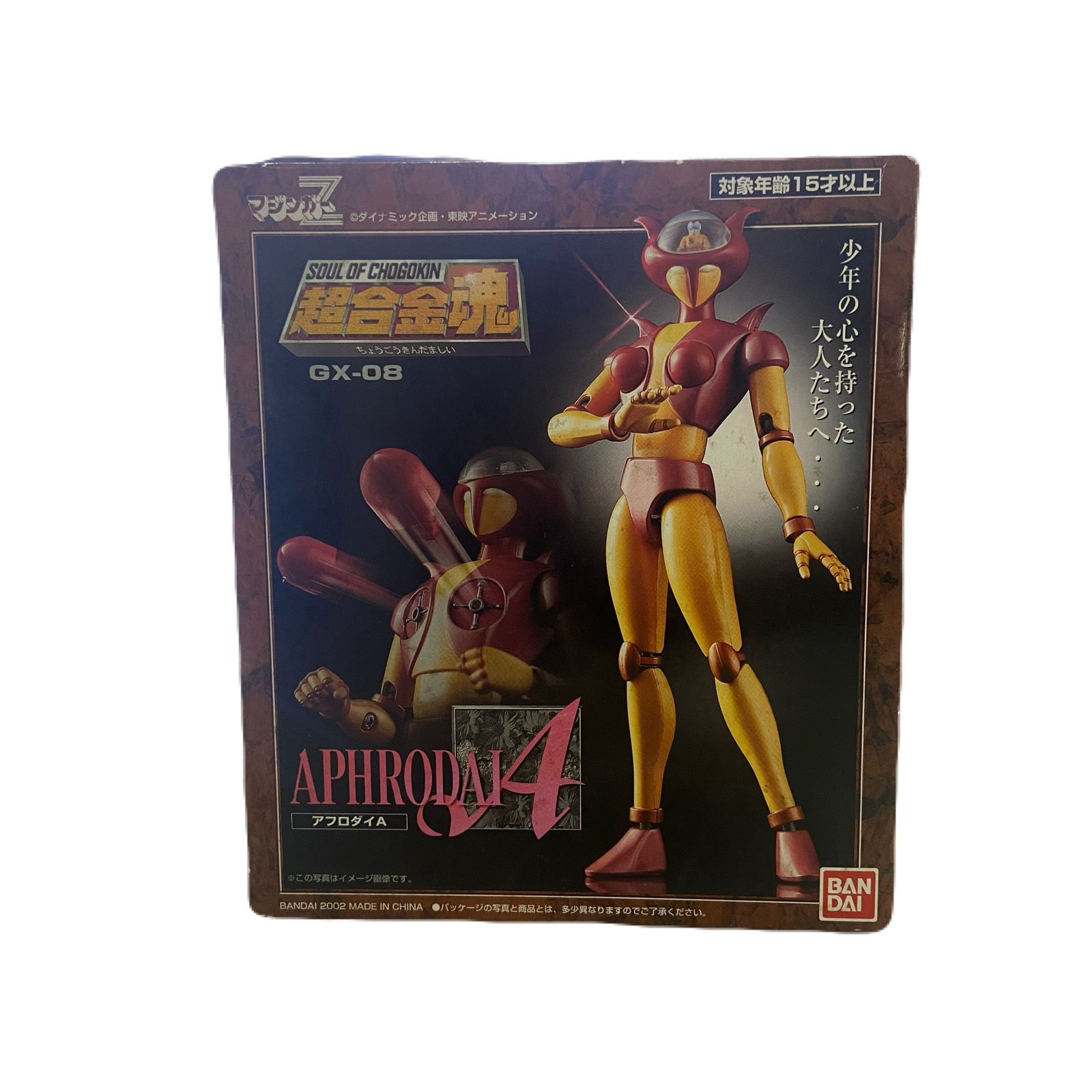 The Soul of Chogokin GX‑08 Aphrodai A is a premium 16 cm‑class die‑cast figure produced by Soul of Chogokin / Bandai, based on the female‑type super robot from the classic Mazinger Z anime series. The figure features high‑quality metal (die‑cast) components in the torso, arms and legs, combined with ABS/PVC materials to capture both solid build and detailed styling. It includes several accessories such as interchangeable hands, chest‑missile parts, and a dedicated display stand, along with a spring‑loaded missile‑launch gimmick from its chest and an improved blue‑tinted cockpit canopy. The sculpt also includes a miniature pilot figure of Sayaka Yumi within the robot’s head, enhancing its dynamic display possibilities. Soul of Chogokin GX-08 Aphorodai A 40th Anniversary